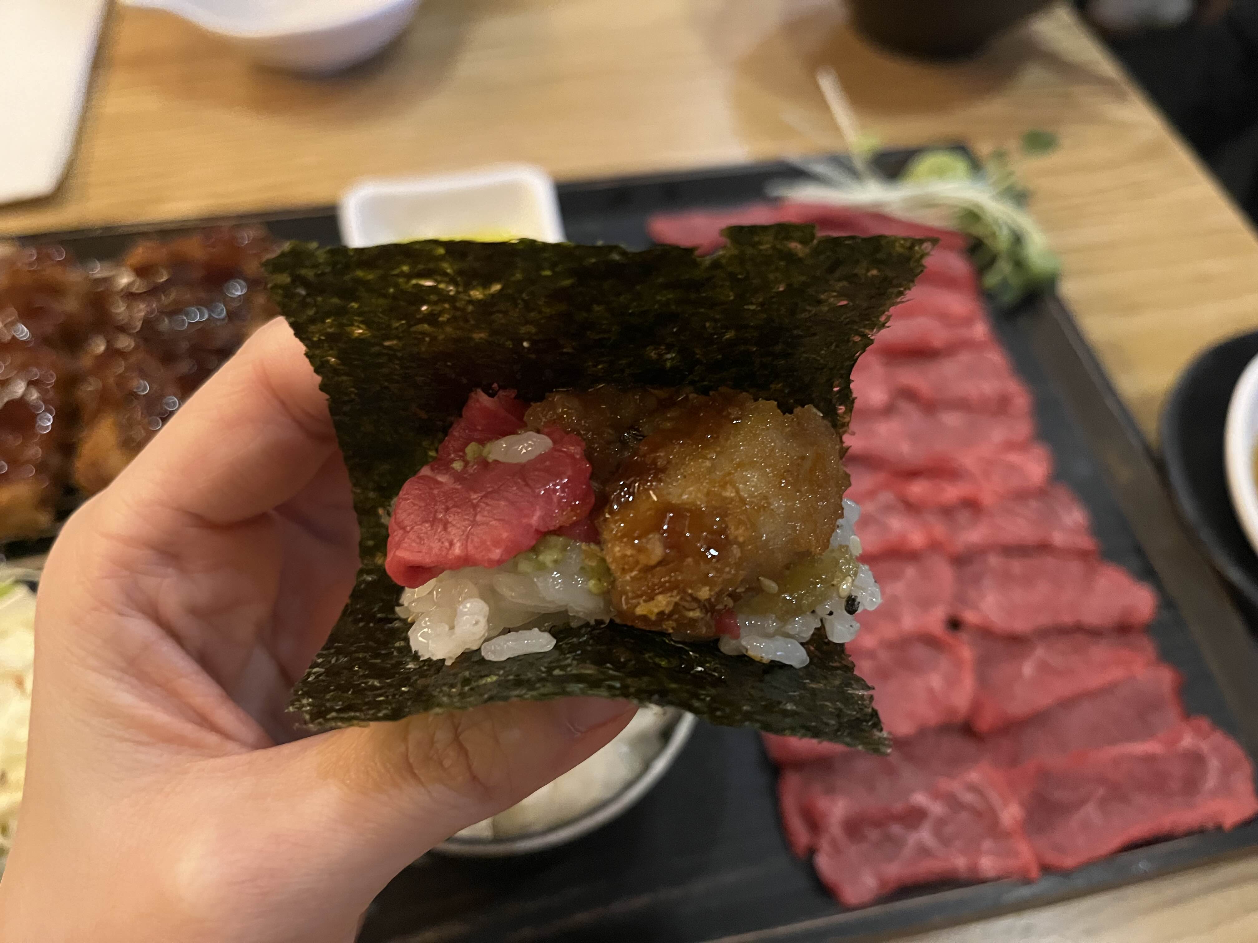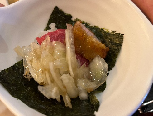 육회랑 돈까스를 김에 싸먹는게
